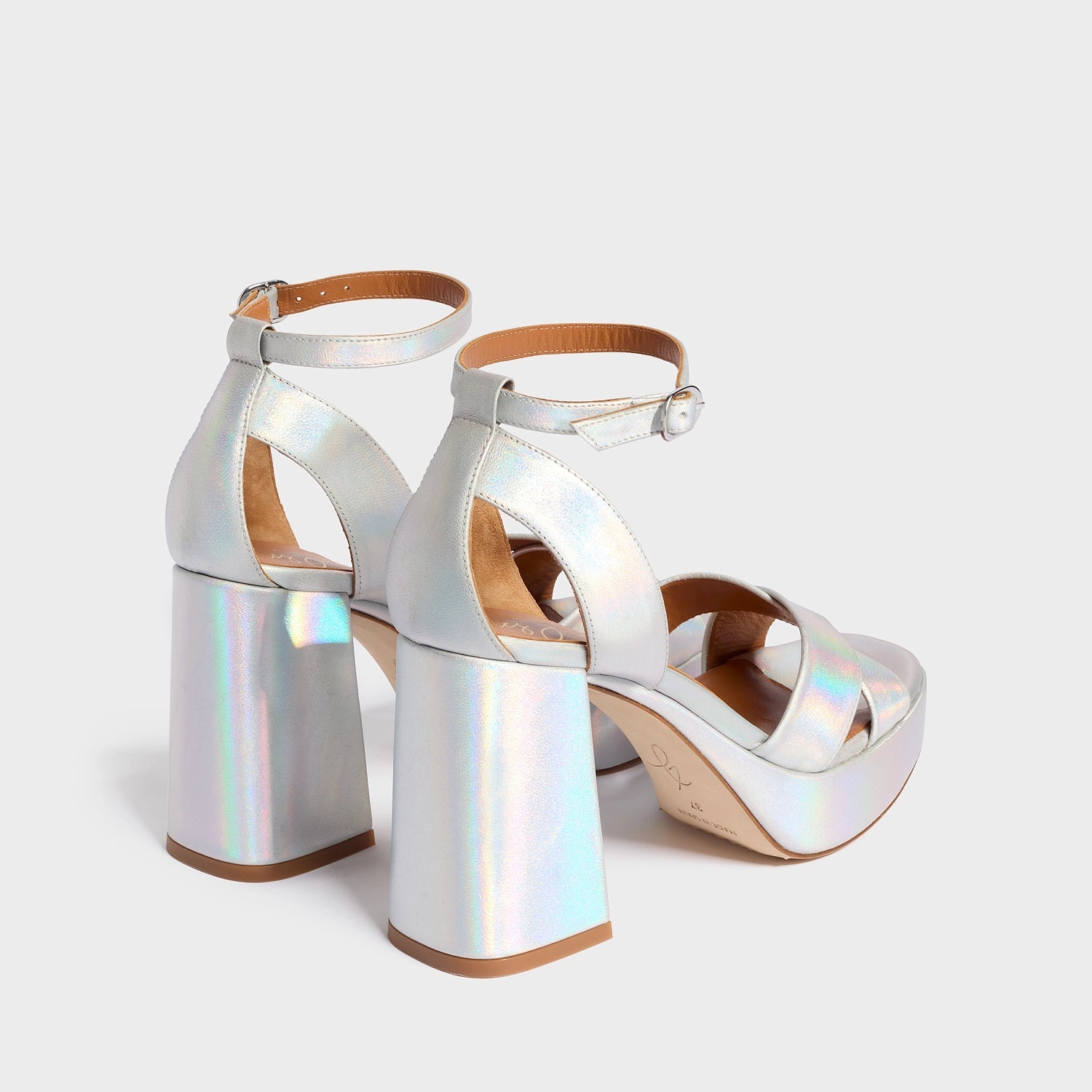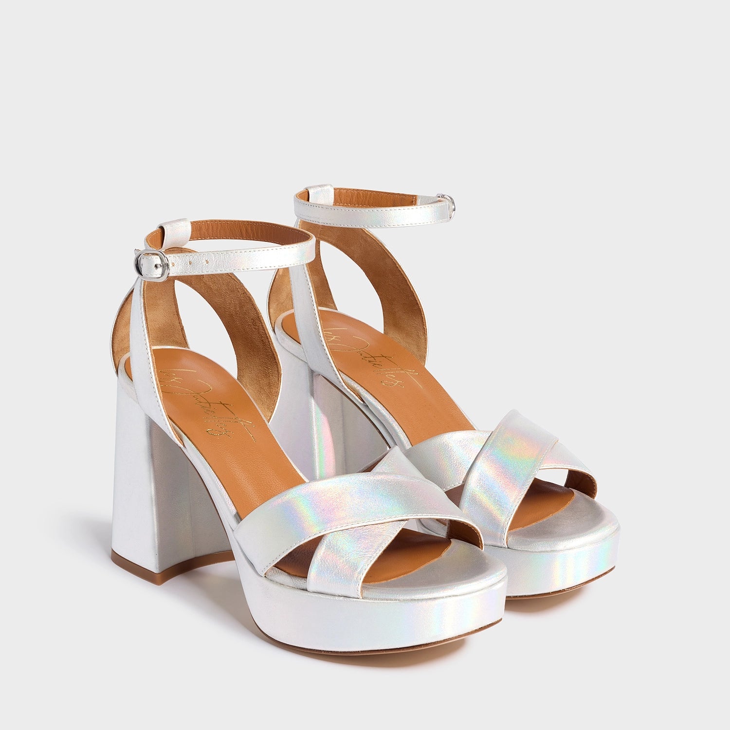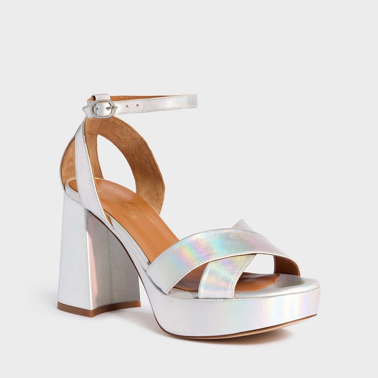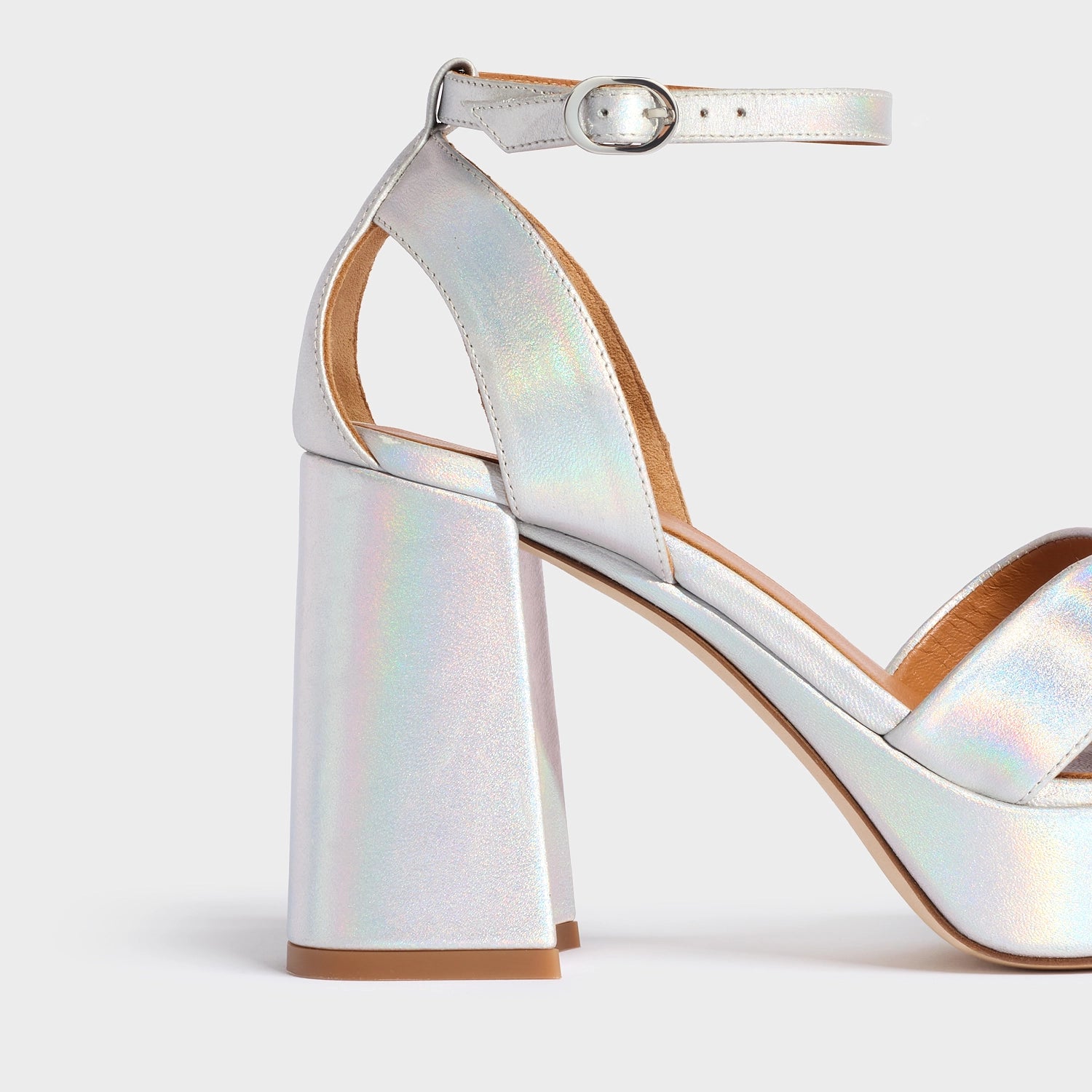 Piel metalizada caprina en plata iridiscente con pala cruzada y talón original en dos piezas para un toque único.