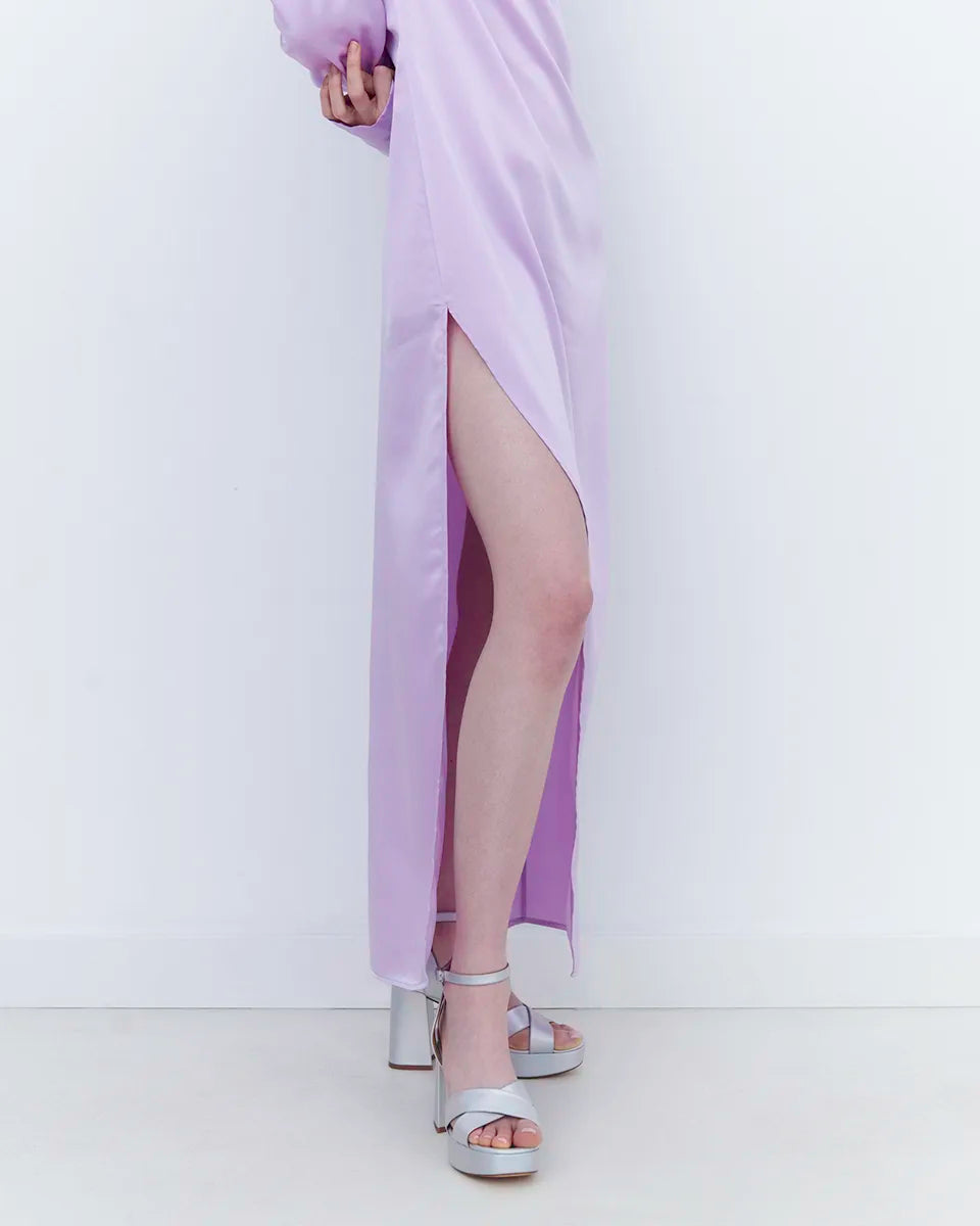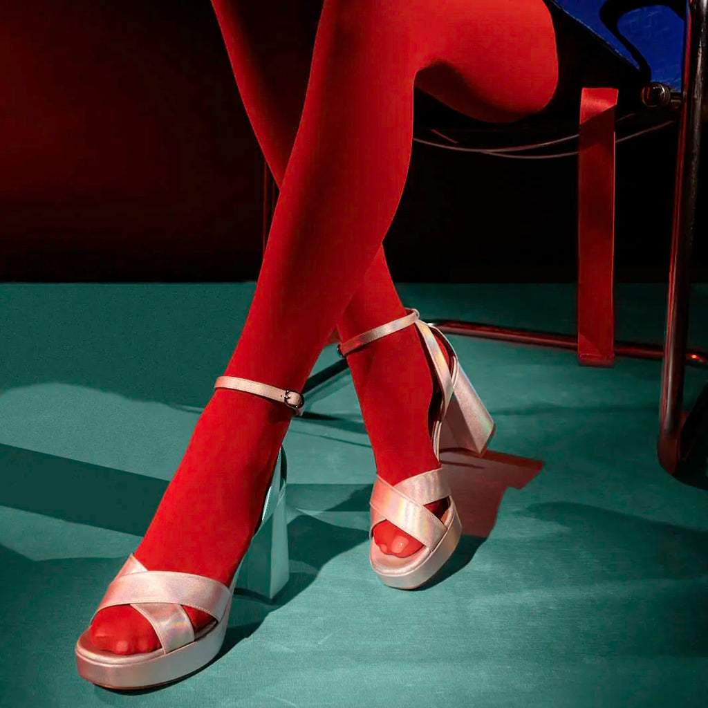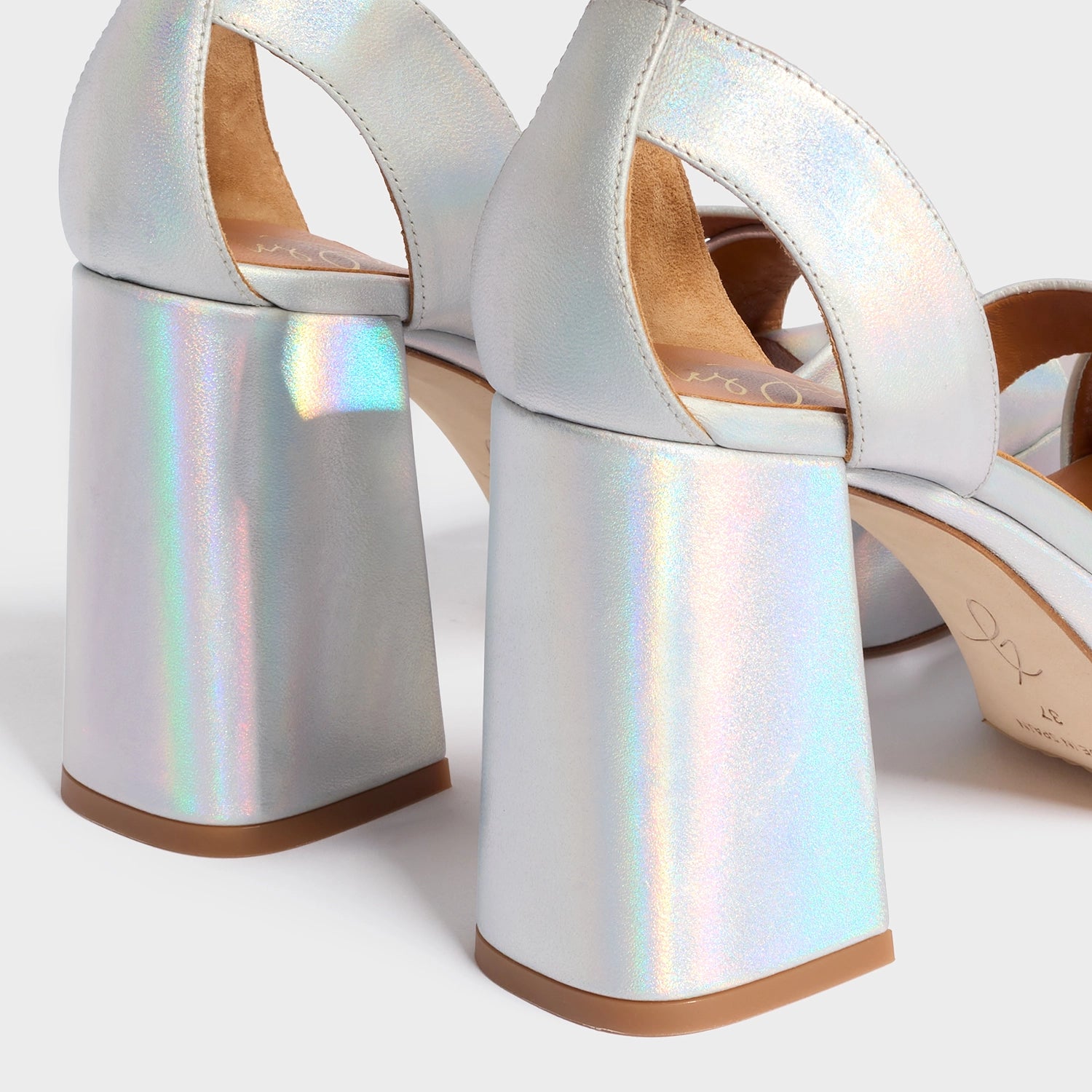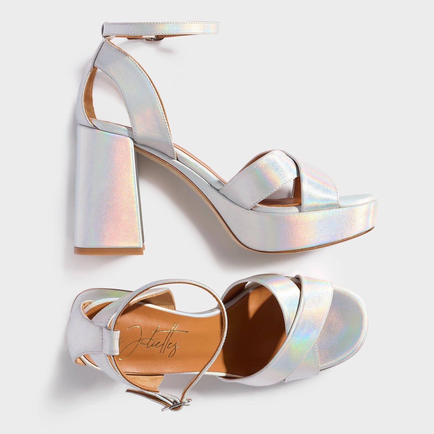 Piel metalizada caprina en plata iridiscente con pala cruzada y talón original en dos piezas para un toque único.
